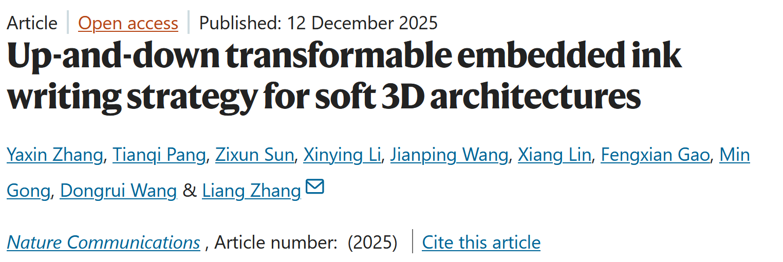 我校williamhill英国张靓副教授最新研究成果——沉浮式墨水直写3D成型技术,以“Up-and-Down Transformable Embedded Ink Writing Strategy for Soft 3D Architectures”为题发表于国际顶级期刊《Nature Communications》。英国威廉公司为该论文的唯一通讯单位,第一作者为英国威廉公司22级博士生张娅欣。