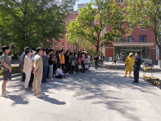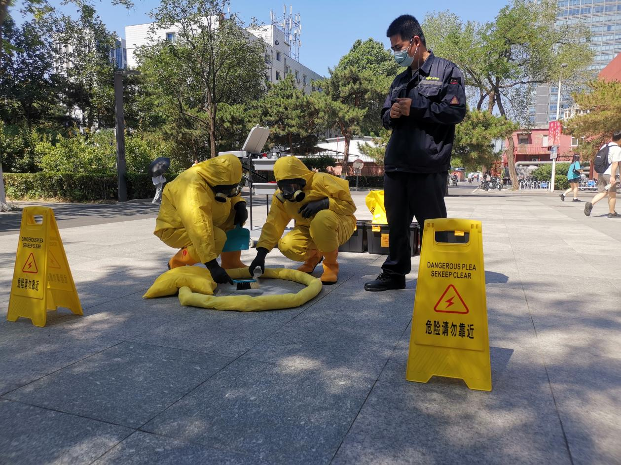 培训会后,参会人员集中到化生楼前广场进行了危化品泄露应急演练。通过现场模拟针对不明危化品泄露事故的处置流程,培训人员充分学习并掌握了危化品事故应急处理流程、防护服穿脱方法、现场清理操作、以及事后安全措施等内容,有效提高了参训师生应急处置能力。