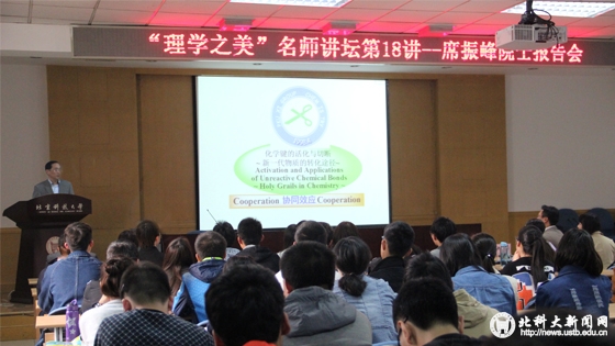 席教授结合自身的科研经历,就专业知识和学科前沿领域的技术问题进行了精彩的报告。他指出,工作中要有创新精神,并提倡协同合作。席教授在报告中通过其实验室的logo,为同学们详细介绍了其实验室的发展、理念和文化。logo为一把绿色的剪刀,体现为剪断化学键,并象征着协同效应,及同学之间要相互合作,相互学习,剪刀的一长一短代表选择性,绿色代表绿色化学。之后讲述了双金属有机试剂,为我校师生展示了通过有机锂和co合成羰基化合物,反应化学的选择性控制,双金属有机试剂合成化学及在化学中碳负离子做氧化剂的作用及发展前景。并就“信、深、新”三个字提出了他的科研之道。使大家进一步领略了化学的神奇之美,理学的创新之美,了解了培养创新思维在科学研究中的重要作用。
